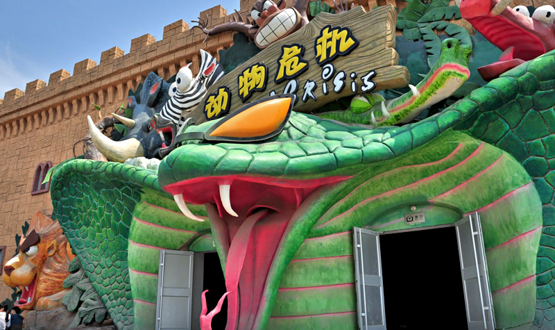 动物危机——4D动感轨道车。科技飞速发展的未来世界,大型动物基因突变,地球面临毁灭,幸存者乘坐超炫时空战车,在英雄三剑客的保卫下突出重围。尖端三维技术及环境特效为你开启末世之旅。